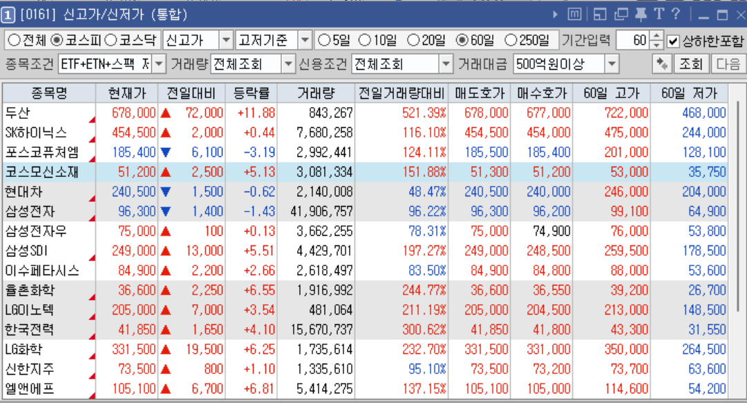 - 60일 신고가 + 10% 이내 갭상승 + 거래량 3~4배 종목 주목.