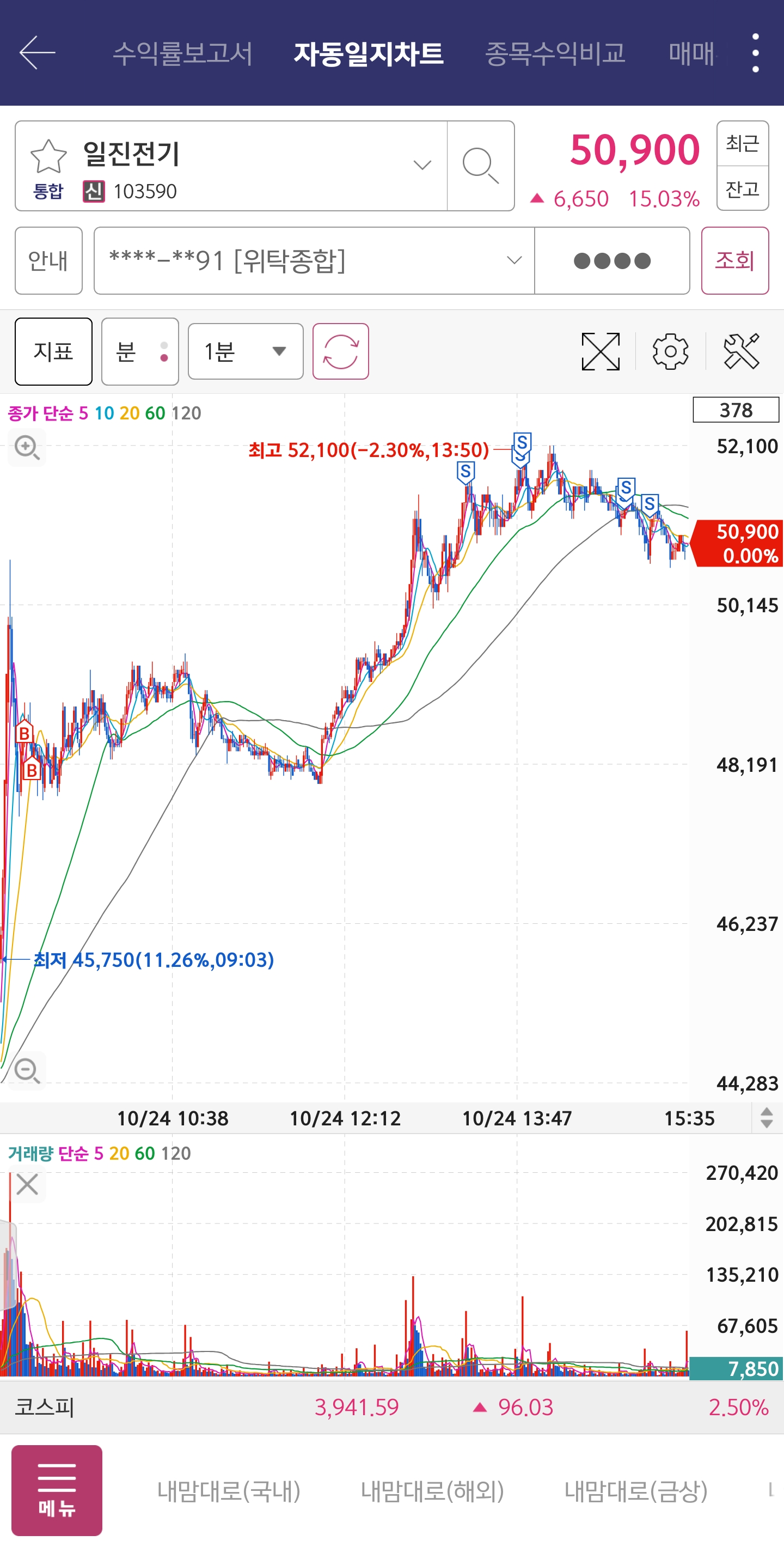 - 대한전선(2등주)보다 상승률이 더 강하게 유지되어 종목 교체(갈아타기).